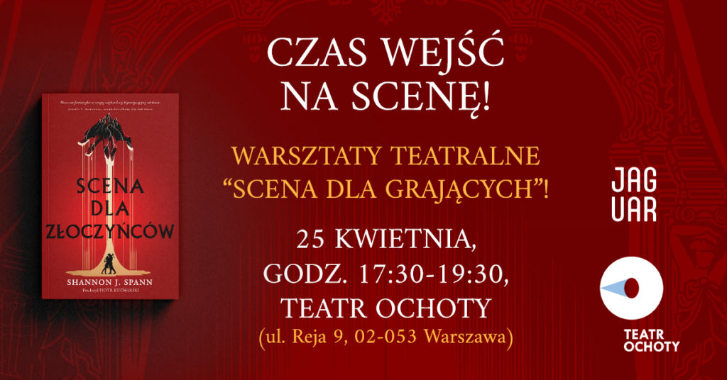Zapraszamy na warsztaty towarzyszące premierze polskiego wydania książki „Scena dla złoczyńców” Shannon Spann. Zmierz się z samym sobą i sprawdź czy Scena jest miejscem dla Ciebie. Zapraszamy na warsztat-doświadczenie, podczas którego możesz dotknąć i sprawdzić na sobie magię teatru. Zmierz się w kilku wyzwaniach – szermierce dialogu, uderzeniu monologu, zabójczej